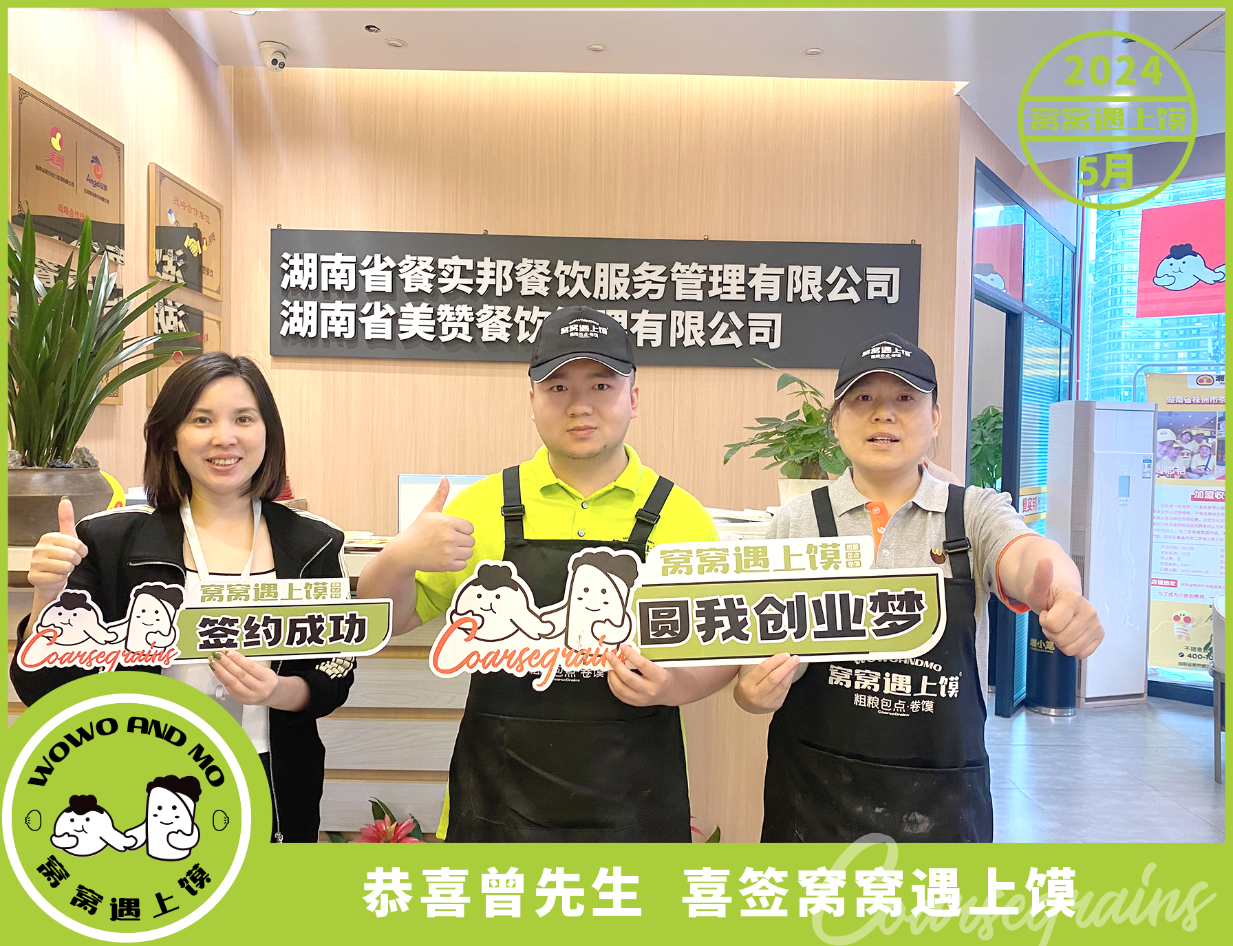 恭喜曾总喜签窝窝遇上馍 曾总是一名军人,退伍后陆续做了几份工作,曾总说不想打工了,想回到自己的家乡成家立业,陪伴父母。对于窝窝遇上馍这个项目也非常熟悉,在当地吃过我们的产品,姐姐也是窝窝遇上馍的忠实粉丝,每天必吃。有了这个创业梦后,家里人都非常的支持,在家人的陪同下来到长沙总部直接签约合作。预㊗曾总早日开业,生意兴隆,财源滚滚